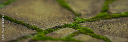 Old paved sidewalk made of wild stone with green moss in the seams.
