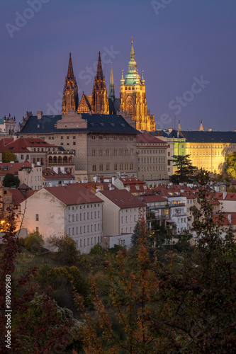 Old Prague houses and St. Vitus Cathedral, view from Petrin hill in Prague, Czech Republic