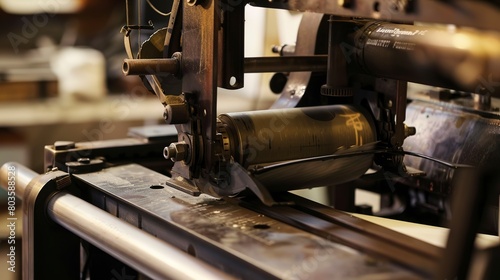 Old printing press in action, close-up, detailed type setting and paper feeding
