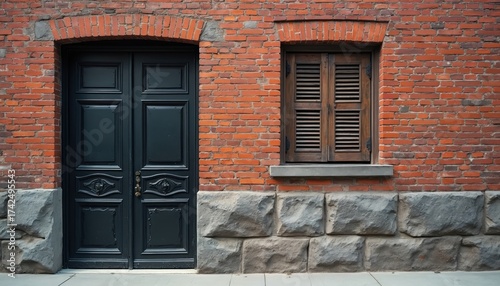 Old red brick building facade with black door and wooden shutters. Exterior of vintage loft apartment with aged wall and stonework. Urban scene of residential house front. Home design concept.