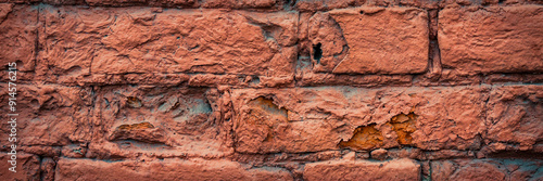 Old red brick wall. The texture of weathered grungy brickwork. Wide panoramic background with masonry.