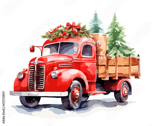 Old red truck with gift boxes and christmas tree in them, in the style of realistic watercolor paintings on transparent background. Generative AI.