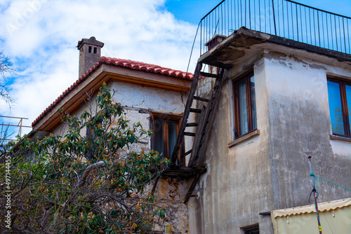 Old residential private house in the old town of the resort region of Turkey. The roof is tiled, there are cracks in the walls, a dilapidated staircase on the side of the house.
