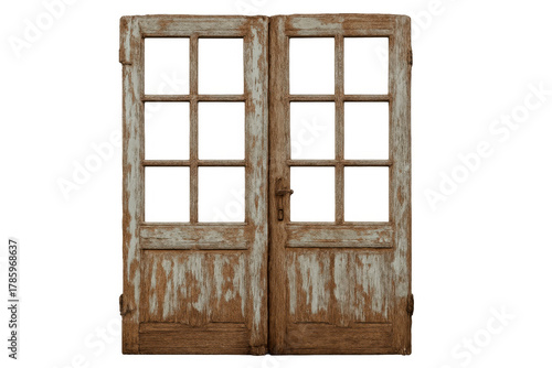 Old rustic wooden french doors with peeling paint, vintage style, isolated on transparent background