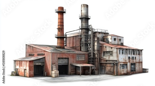 Old Rusty Industrial Factory Building Exterior 3D Render Detailed Vintage Architecture Grungy Urban Scene Isolated White Background Perfect for Design