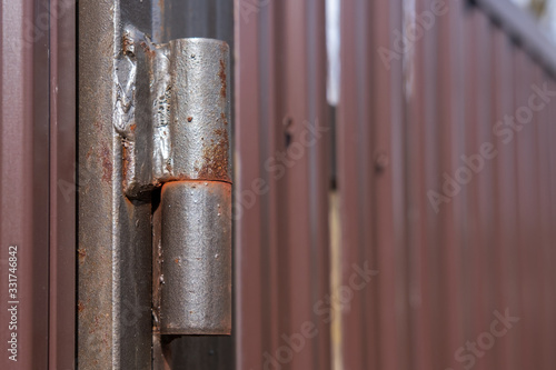 Old rusty loop of a metal fence (gate) of brown color. Fence made of brown metal fencing bolted vertically.