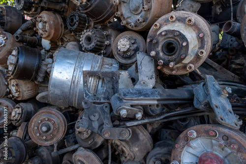 Old rusty truck axles piled in a scrap yard. Discarded heavy truck parts in metal recycling area. Truck axle scrap metal waiting for recycling.