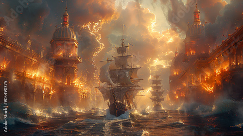 Old sailing ship is battling its way through a stormy sea at sunset, with dramatic clouds and golden light illuminating the scene