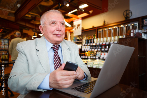 Old senior businessman in suit and tie with laptop computer and smartphone, sitting in city cafe house