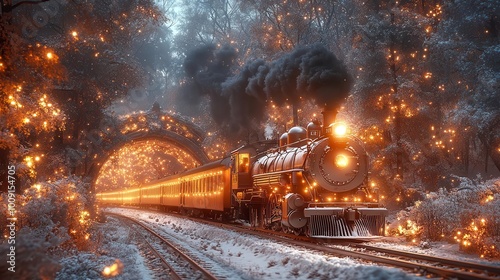 old steam locomotive chugging through a snowy forest at night with soft glowing lights creating a magical and nostalgic winter scene in 3d illustration