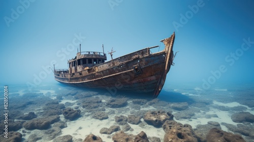 Old sunken ship abandoned in the sea The old ship was abandoned.