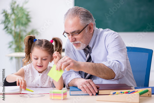 Old teacher and schoolgirl in the school