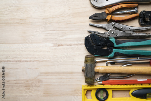 Old tools equipment on wood table background, engineering concept