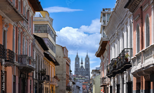 Old Town in Quito, Ecuador. Colonial colorful scenic historic city center streets.