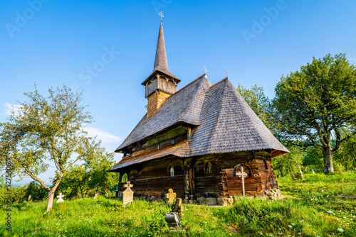 Old traditional orthodox wooden church "The birth of the Mother of God", a UNESCO world heritage site, located on a hill in Barsana, Maramures county, Romania