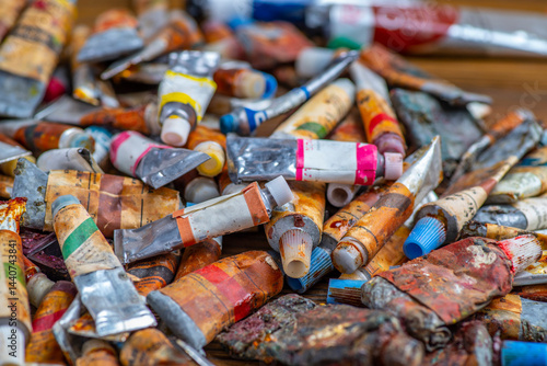 Old used paint tubes in an artist's studio