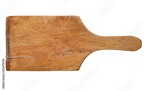 old, used, rustic wooden cutting board, isolated on white background