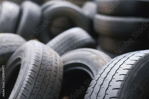 Old used tires stacked with high piles. close up damaged worn black tire tread car. tread problems and solutions for road safety concept. Change time. transportation.