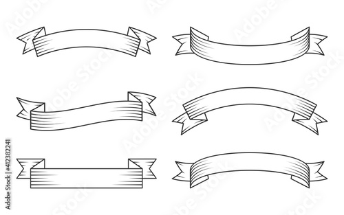 Old vintage black linear ribbons set. Retro decorative outline banner tape in engraving style. Different shape blank simple template tapes flag text price tag, sale label. Isolated vector illustration