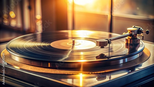 Old vinyl record with a transparent cover spinning on a vintage turntable, surrounded by warm soft light and subtle shadows, evoking nostalgia and musical memories.