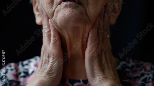 Old woman experiencing neck and throat pain, pressing her neck with a pained expression. Wrinkles and age details are visible