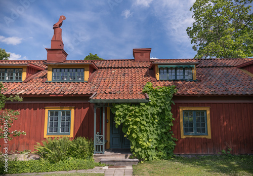 Old wood 1800s red house with dorms, tin chimney and entrance covered in flower leaves, a summer day in Stockholm