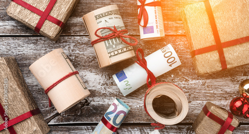 Old wooden background, American money, gifts. Top view. Different values. Space for text. Light effect.