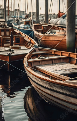 Old wooden boats in a harbor. Created with Generative AI technology.