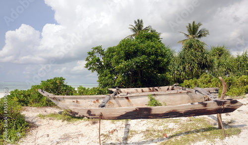 old wooden fishing boats with paddles on a beach of fishing village in Zanzibar