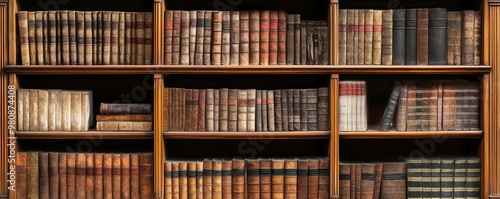 Old wooden shelves in a Victorian study, filled with well-read classics and ink-stained manuscripts, Victorian bookshelf, literary history, Classical literary collections