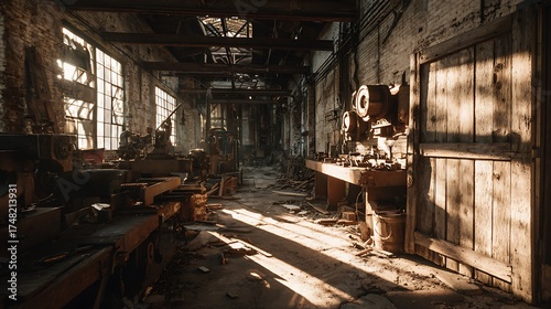 Old workshop interior with sunbeams and debris