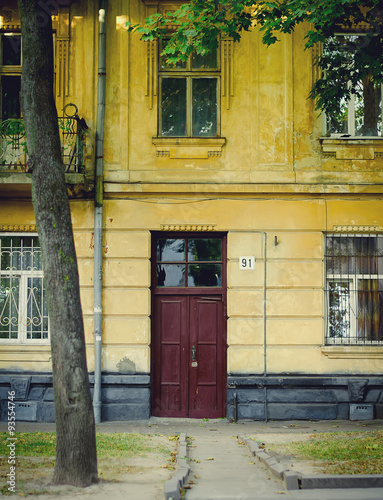 old yellow house facade with red door