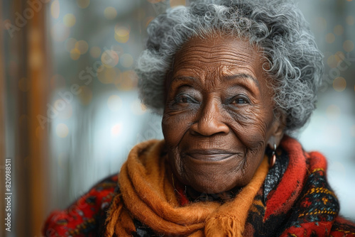 Older black woman with grey hair and scarf outdoors in winter for marketing campaign