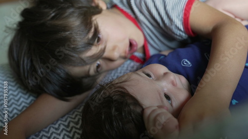 Older brother lying beside baby sibling on a couch, both resting peacefully, sharing an intimate moment of bonding and connection in a cozy home setting