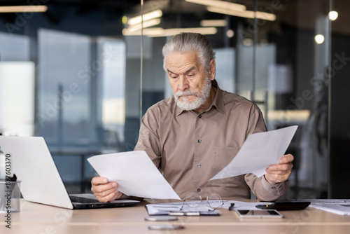Older male professional analyzing paperwork while working on a laptop in a contemporary office setting. The man is focusing on the details of the documents, reflecting concentration and diligence.