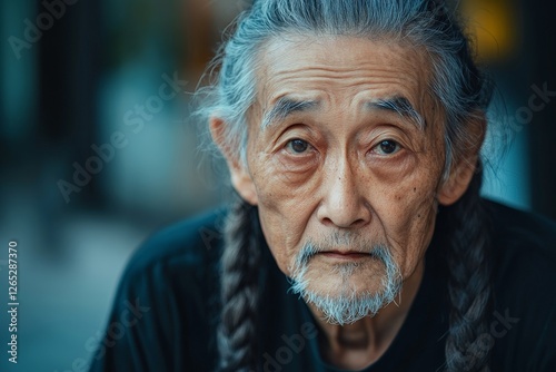 Older man with long braids gazes thoughtfully into the distance in a city setting during the evening hours