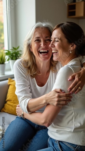 Older mother and her adult daughter share a joyful moment while laughing and embracing at home. The atmosphere is warm and loving, highlighting their bond.