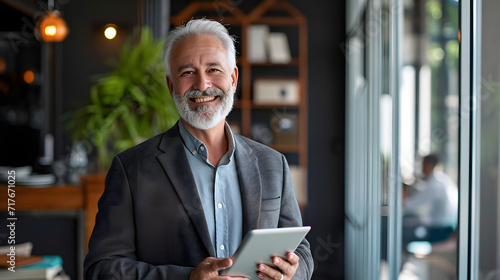 Older smiling business man holding tablet standing in office. A middle-aged, content manager and investor uses a tab computer, as an older, more experienced male executive watches the camera at work.