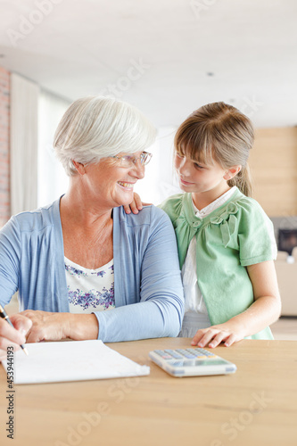 Older woman and granddaughter using calculator