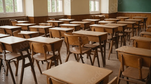 old-fashioned classroom featuring rows of wooden desks and chairs facing a clean, empty green chalkboard, indicative of a break in lessons or the end of a school day