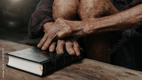Oldmans hands together in prayer to God along with the bible In the Christian concept and religion, woman pray in the Bible