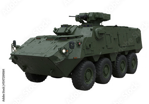 Olive drab armored vehicle isolated on a transparent background. Military equipment and technology.