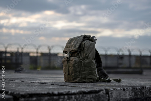 Olive Green Tactical Backpack On Concrete Overlooking Barbed Wire And Sky In Twilight