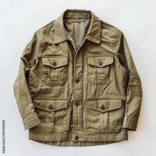 Olive green utility jacket with multiple pockets, button closure, and long sleeves.