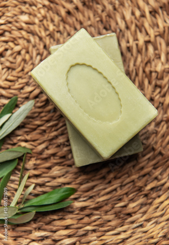 Olive soap bars resting on a woven mat with olive branch