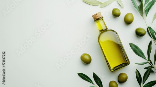 Olives with leaves and a bottle of olive oil showcased on a clean white backdrop, highlighting freshness.