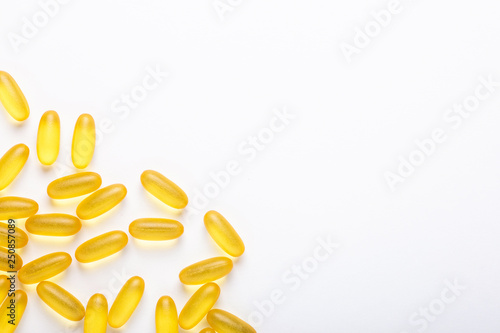 Omega 3 capsules on white background Fish oil Yellow softgels Vitamin D, E, A supplement Concept of healthcare
