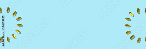 Omega3 gel capsule. Yellow vitamin. Health eating. Dietology drug. Fish oil supplement. Cirlce concept. Golden color softgel collagen. Blue background. Medicine immunity cosmetics