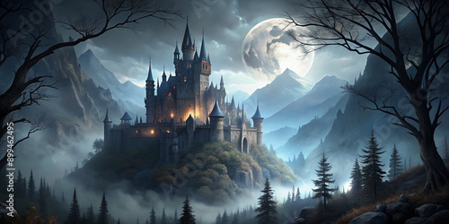 Ominous dark gothic castle looms in a desolate gray valley, surrounded by twisted trees, under the eerie glow of a full moon in a gloomy mountain range.