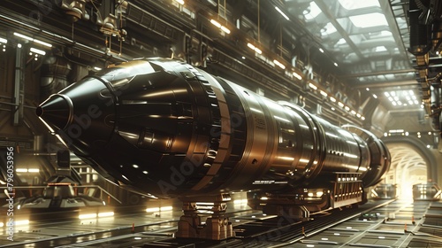Ominous nuclear warhead in a hightech scifi setting, depicted with stark clarity and zero noise
